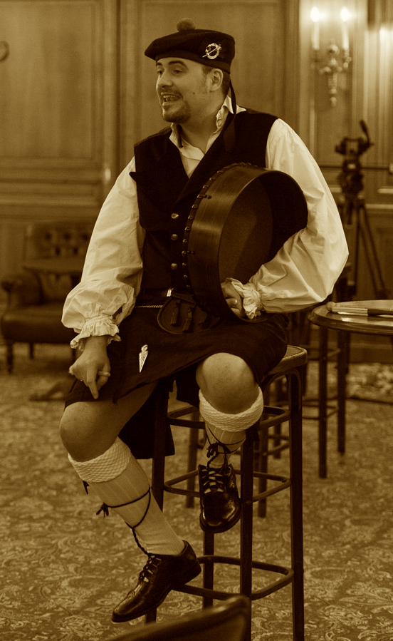 Patrick Caudal, conte, bodhran (tambour irlandais), cornemuse et lyre bardique